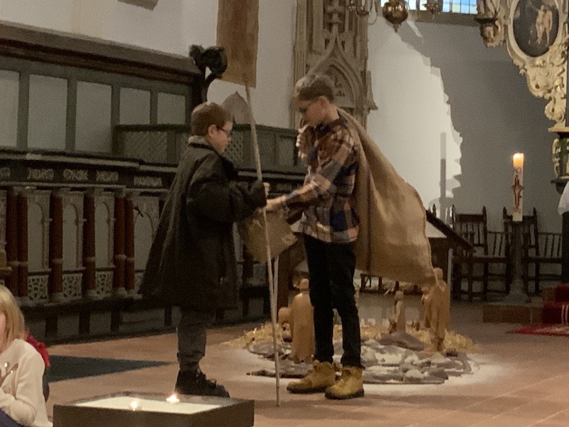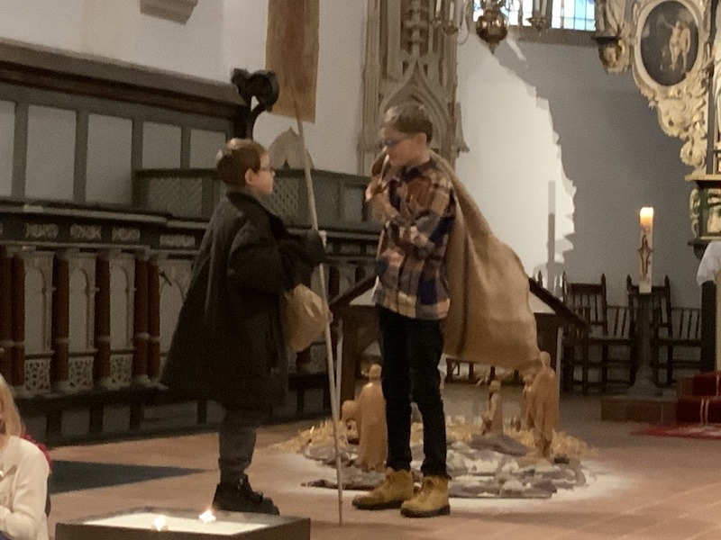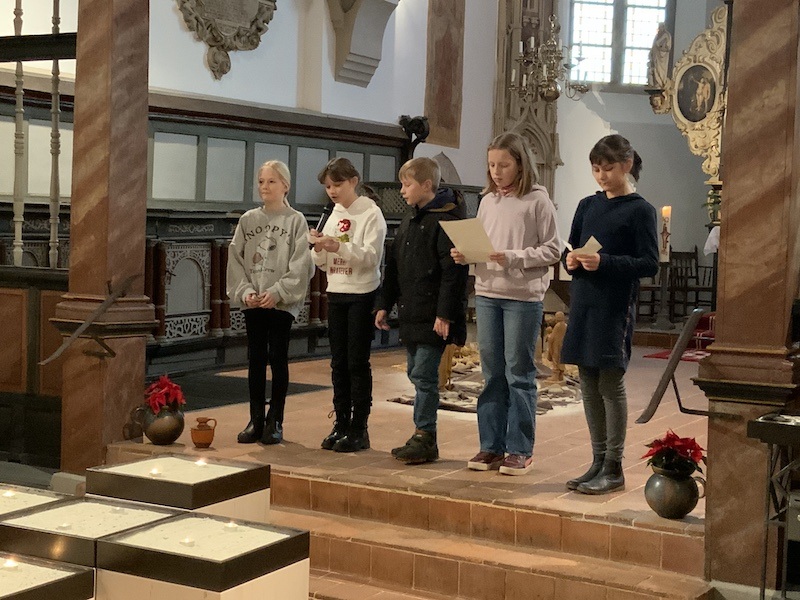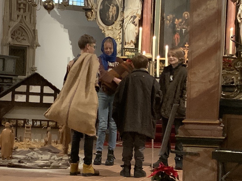 Aufgeregt treffen sich die Schülerinnen und Schüler des Jg.5 in der St. Silvesterkirche. Pastorin Hachmeister-Ücker begrüßt die jungen AGQler und freut sich, dass so viele zum Gelingen des Gottesdienstes beitragen. Die Religionsgruppe von Frau Krull hat ein „anderes“ Krippenspiel mit „Der kleine Hirte und der große Räuber“ eingeübt. Sie stellen anschaulich dar, dass in Zusammenhang mit der Geburt Jesu Menschen zum Schenken und Miteinander aufgerufen sind. Musikalisch unterstützt die Streicherklasse von Herrn Steiner eindrucksvoll den Gottesdienst mit „Jingle Bells“ und die Religionsgruppe von Frau Greten präsentiert gesanglich „Stern über Betlehem“. Insgesamt machen die Ansprache von Pastorin Hachmeister-Ücker und die Fürbitten der Kinder deutlich, worauf es beim Weihnachtsfest ankommt. Am Ende bekommt jeder Teilnehmer noch einen selbstgebastelten Weihnachtsstern.