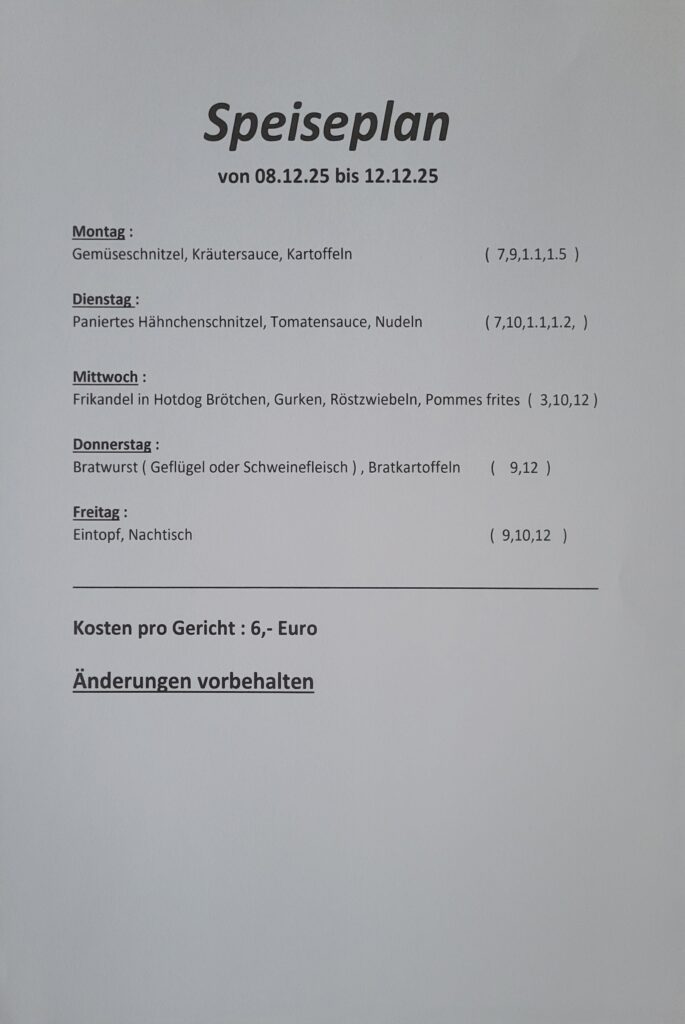 Wir bitten um Beachtung des unten stehenden Menüplans.