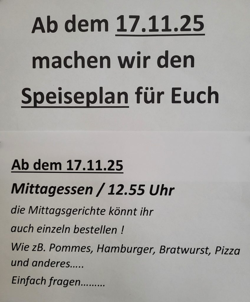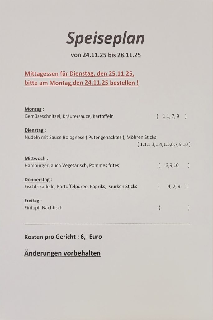 Wir bitten um Beachtung des unten stehenden Menüplans.