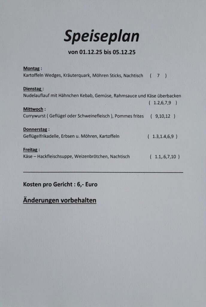 Wir bitten um Beachtung des unten stehenden Menüplans.
