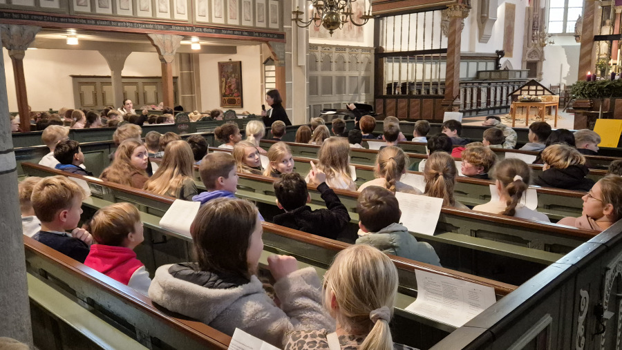 Am Donnerstag, den 04.12.2025 stimmte sich unser 5. Jahrgang im Rahmen des Religionsunterrichts auf die Adventszeit in der St. Sylvester Kirche ein. Der Religionskurs von Frau Krull hatte einen Gottesdienst zum Thema „Adventskranz“ vorbereitet und die Religions- und Werte und Normenkurse eingeladen. Es wurde unter der Anleitung von Pastorin Hachmeister-Uecker darüber gesprochen, welche Herkunft und Funktion der Adventskranz eigentlich hat. Außerdem gab es ein kleines Schauspiel, in dem die Schülerinnen und Schüler einen Adventskranz schmückten und hinterfragten warum sie diesen mit Tanne und Nüssen schmückten. Die traditionellen Adventslieder wurden ebenfalls gemeinsam gesungen. Die Schülerinnen und Schüler hatten eine große Freude daran, gemeinsam diesen Gottesdienst zu erleben. [Kr]