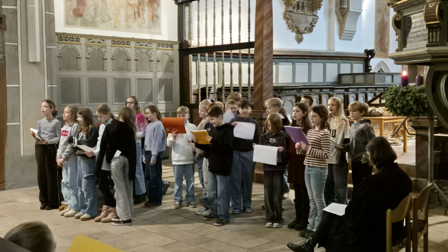 Am Donnerstag, den 04.12.2025 stimmte sich unser 5. Jahrgang im Rahmen des Religionsunterrichts auf die Adventszeit in der St. Sylvester Kirche ein. Der Religionskurs von Frau Krull hatte einen Gottesdienst zum Thema „Adventskranz“ vorbereitet und die Religions- und Werte und Normenkurse eingeladen. Es wurde unter der Anleitung von Pastorin Hachmeister-Uecker darüber gesprochen, welche Herkunft und Funktion der Adventskranz eigentlich hat. Außerdem gab es ein kleines Schauspiel, in dem die Schülerinnen und Schüler einen Adventskranz schmückten und hinterfragten warum sie diesen mit Tanne und Nüssen schmückten. Die traditionellen Adventslieder wurden ebenfalls gemeinsam gesungen. Die Schülerinnen und Schüler hatten eine große Freude daran, gemeinsam diesen Gottesdienst zu erleben. [Kr]