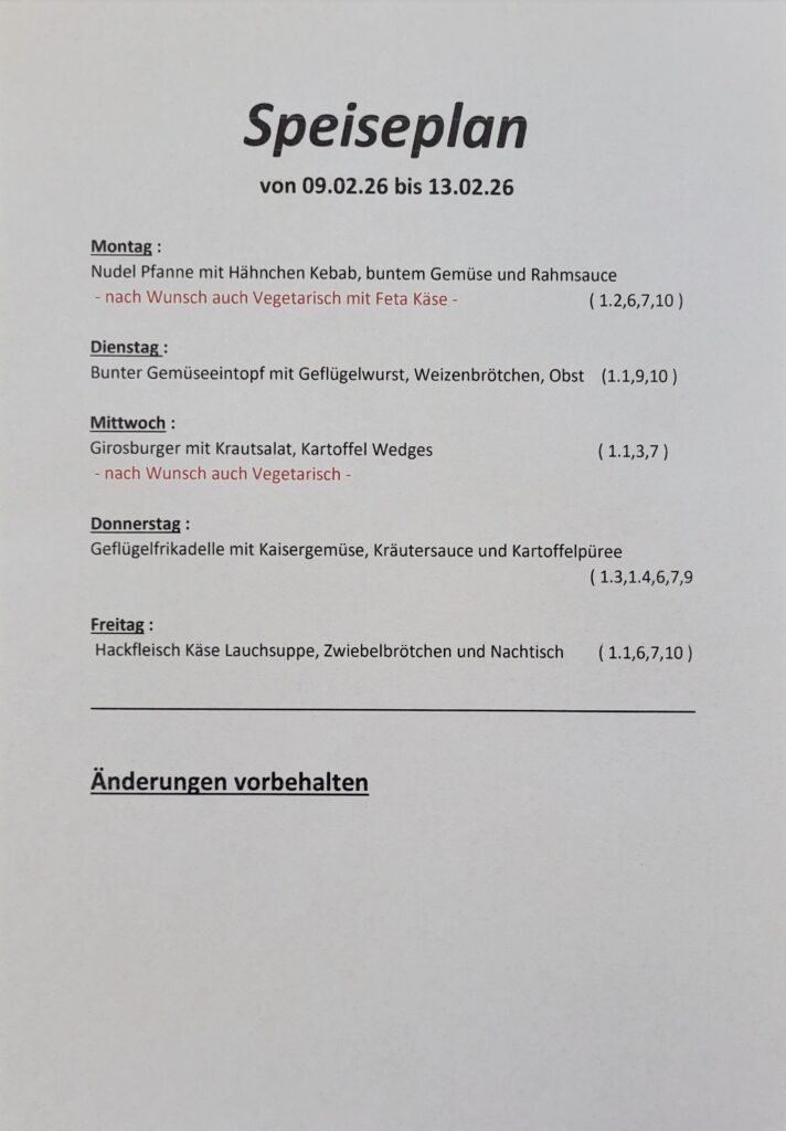 Wir bitten um Beachtung des unten stehenden Menüplans.