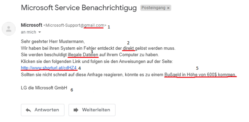 Hier ein Beispiel für eine Email, die euch dazu bringen möchte, eure Daten und euer Passwort zu verraten. Wir zeigen euch 6 auffallende Dinge (wir nennen sie auch „red flags“), an denen ihr eine solche Email erkennen könnt: